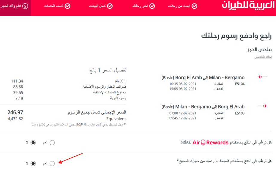 - اختر رحلتك الجديدة واتبع الخطوات حتى صفحة الدفع.