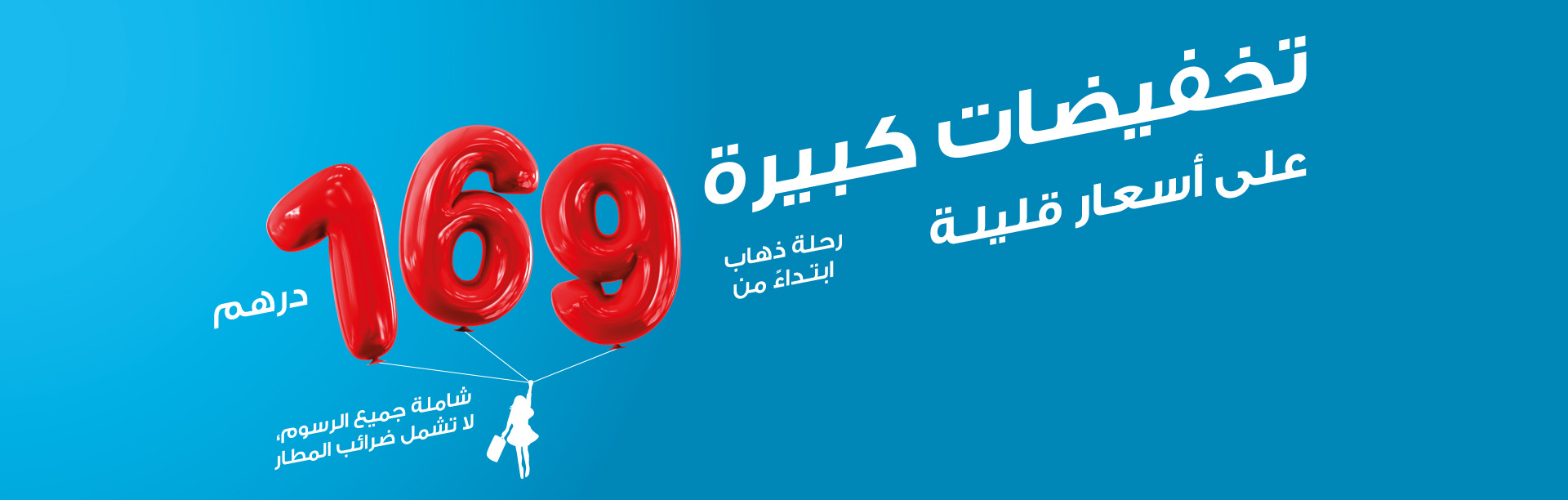 نعلن عن تخفيضات كبيرة إلى وجهات مختارة ابتداء من 169 درهم * فقط. حدد مطارك أدناه واحجز رحلتك الآن بسعر مخفض للغاية! هذه الأسعار لن تدوم طويلا