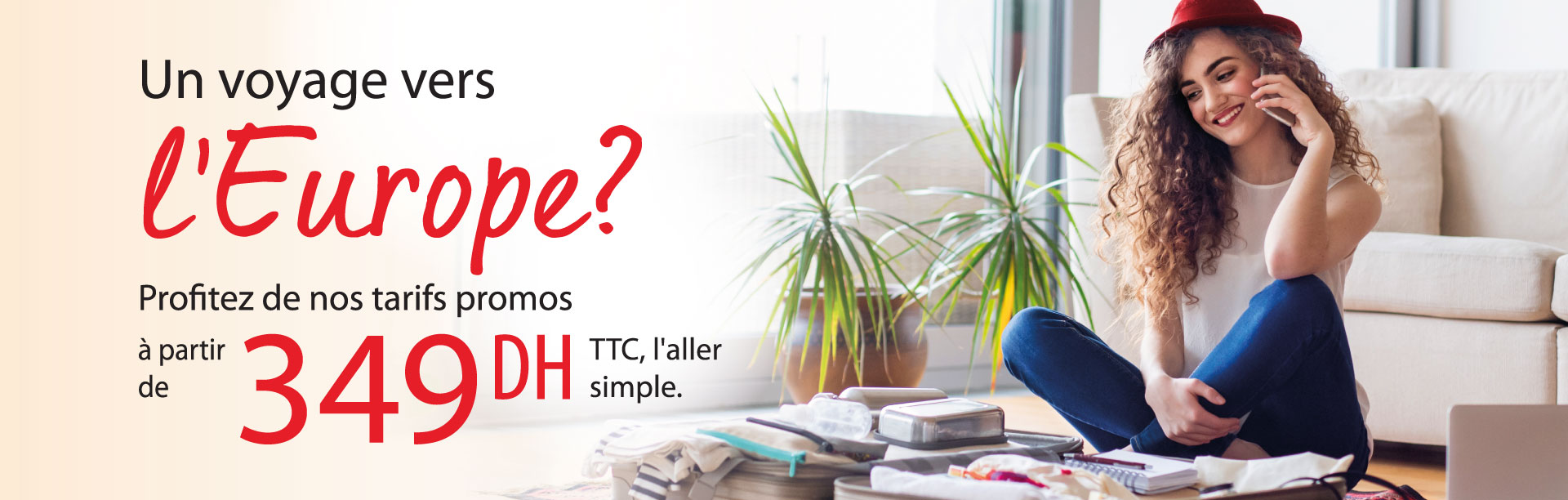 Voyagez vers l'Europe à partir de 349 Dh TTC seulement. Sélectionnez votre origine ci-dessous et réservez votre vol maintenant pour profiter de cette offre spéciale!