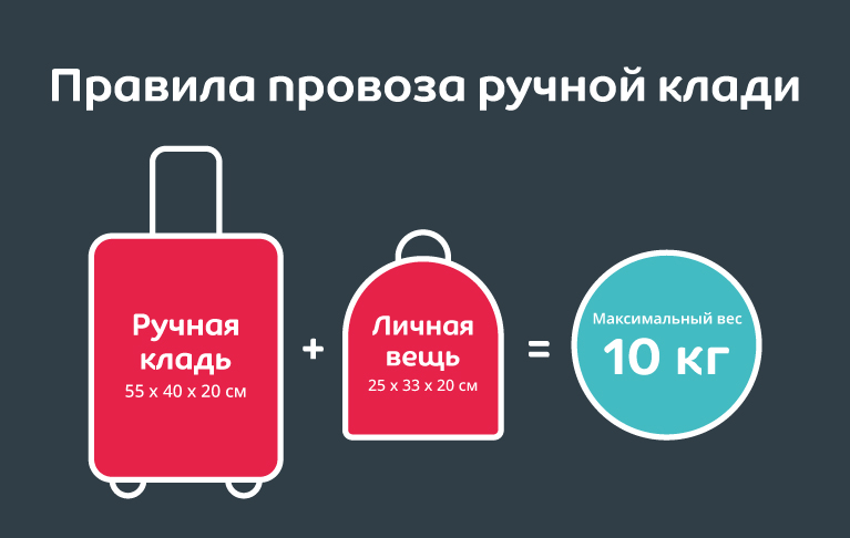 Разрешено провозить 1 личную вещь. Разрешенными личными вещами являются: сумка для ноутбука, женская сумочка или мужская сумка. Максимальные размеры личных вещей: 25см х 33см х 20см. Вещь должна помещаться под сиденьем перед вами и также должна быть задекларирована на стойках регистрации, к каждому предмету должна быть прикреплена бирка.