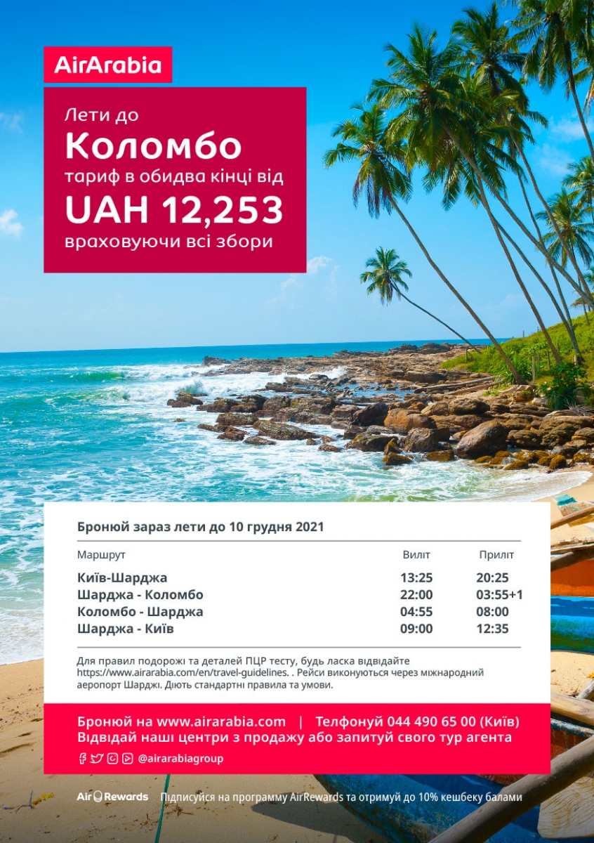 Бронюй свої квитки з Ейр Арабія сьогодні та отримай перевагу наших рейсів з Києва до Коломбо, Шри Ланки починаючи від 12,253 гривень в обидва кінці, включаючи усі збори.