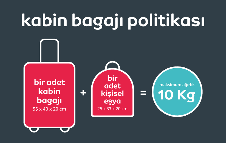 Kabin Bagajı için izin verilen toplam ağırlık 10 Kg'dır. Bu, el çantası, kişisel eşya ve gümrüksüz alışverişleri içerir.